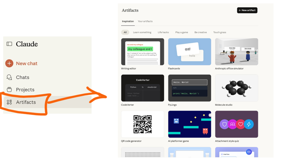 The key idea here is turning your chat into a creation: you describe what you want, and Claude builds a self-contained result that you can interact with, edit, and share.